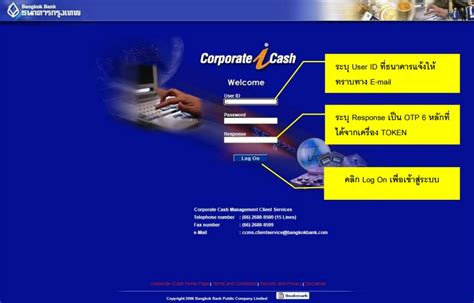 User ID Password Corporate iCash Home Page Terms and Conditions Privacy Notice Disclaimer Copyright 2006 Bangkok Bank Public Company Limited วิธีเข้าระบบ Corporate iCash 1 เข้า website www bangkokbank com Log on เข้าสู่ระบบ เลือก Corporate iCash คอร์ปอเรท ไอแคช 1 2 3 Page 8 8 of 14 หักค่าธรรมเนียมจากบัญชีบริษัทในส่วนค่าธรรมเนียมของธนาคารกรุงเทพ Page 134   วิธีเข้าระบบ Corporate iCash 1 เข้า website www bangkokbank com Log on เข้าสู่ระบบ เลือก Corporate iCash คอร์ปอเรท ไอแคช 1 2 3 Page 8 8 of 14 หักค่าธรรมเนียมจากบัญชีบริษัทในส่วนค่าธรรมเนียมของธนาคารกรุงเทพ Page 134