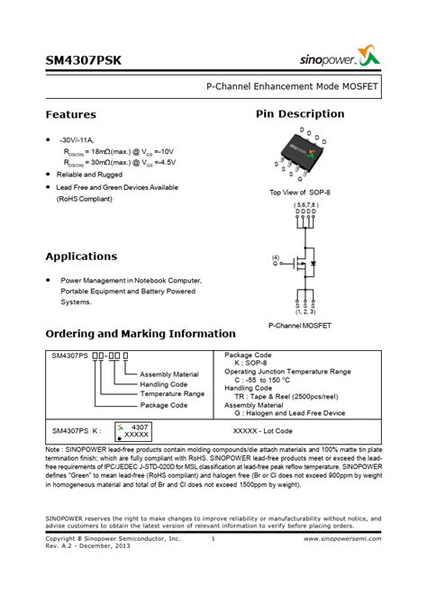 sm4307psk Note : SINOPOWER lead-free products contain molding compounds/die attach materials and 100% matte tin plate termination finish; which are fully compliant ...